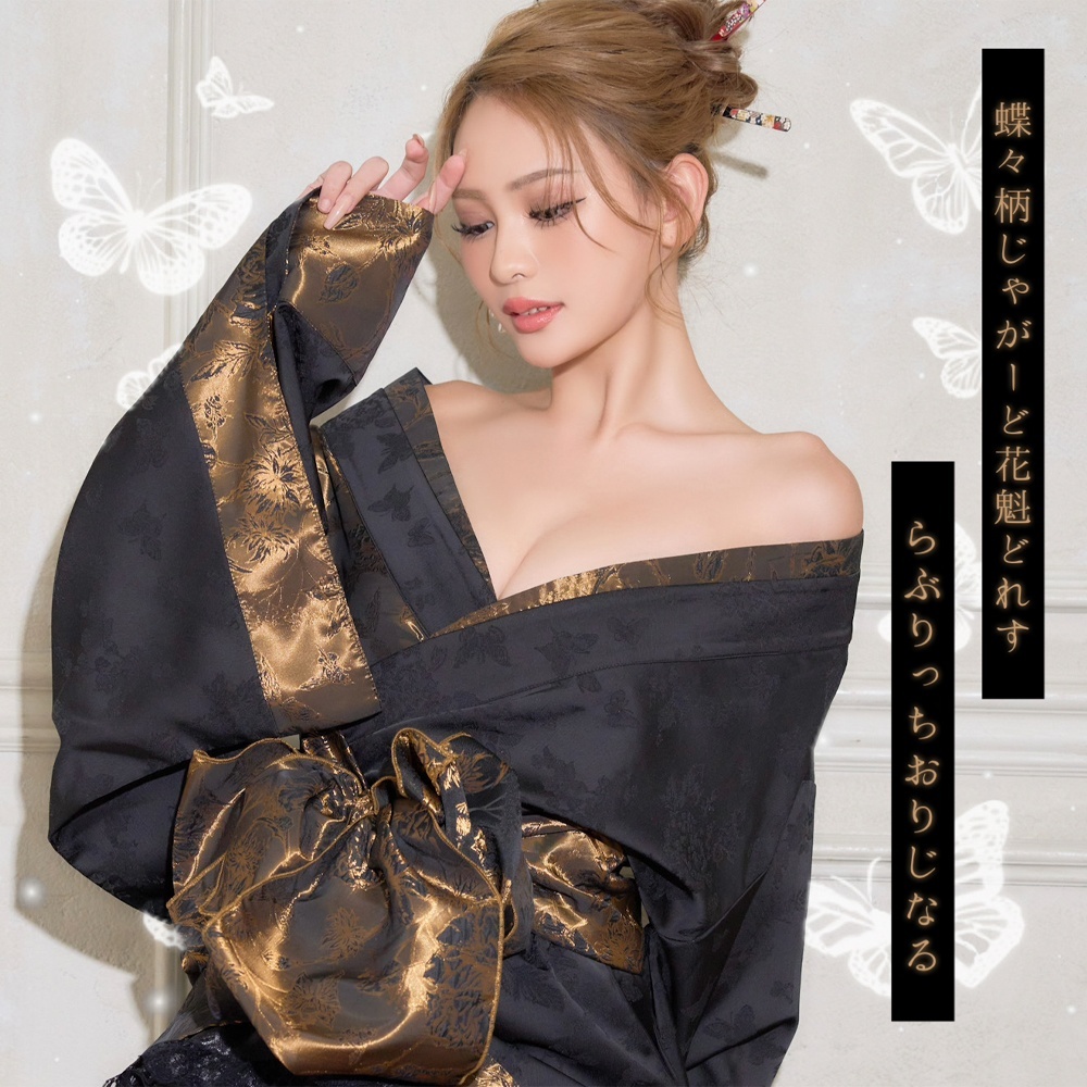 【高級ライン】【2点セット】艶華 花柄 蝶々 ジャガード アシンメトリー 豪華 帯 花魁 着物 ドレス コスプレ ハロウィン キャバドレス [1582]