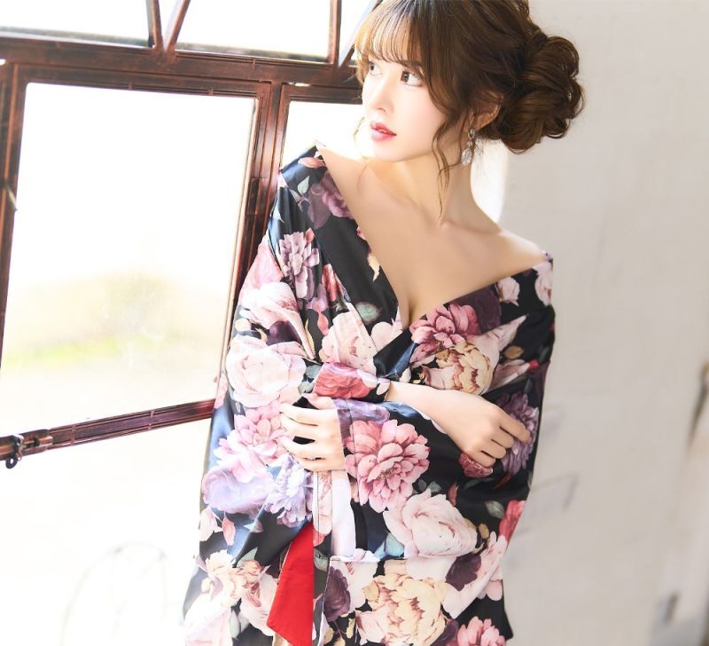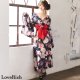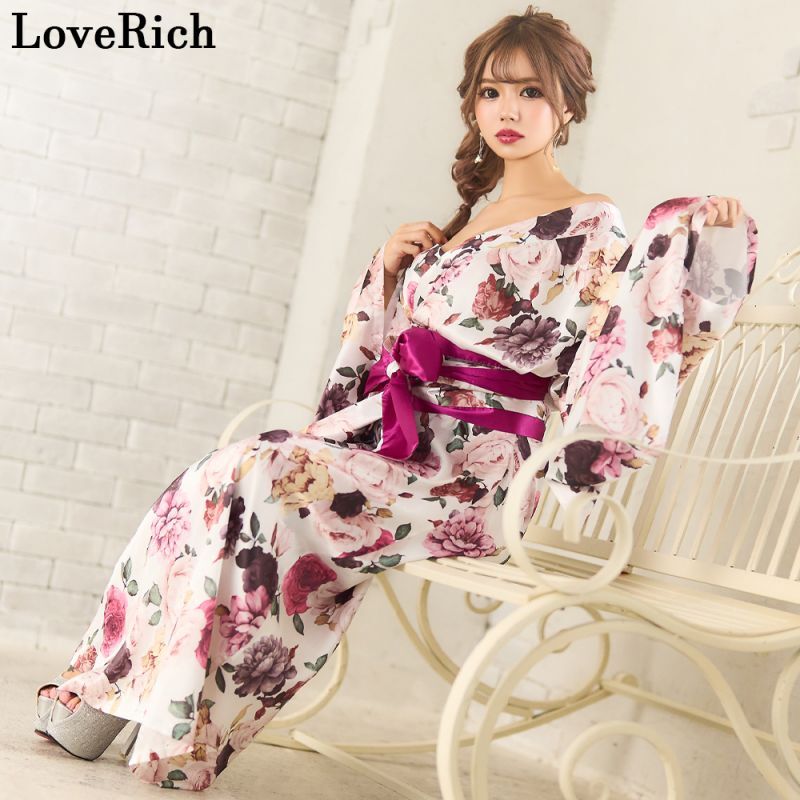 再入荷!【4カラー/2点セット】 花柄 オフショル ロング 前開き 帯 リボン 花魁 着物 ドレス コスプレ イベント ハロウィン キャバドレス [0971]