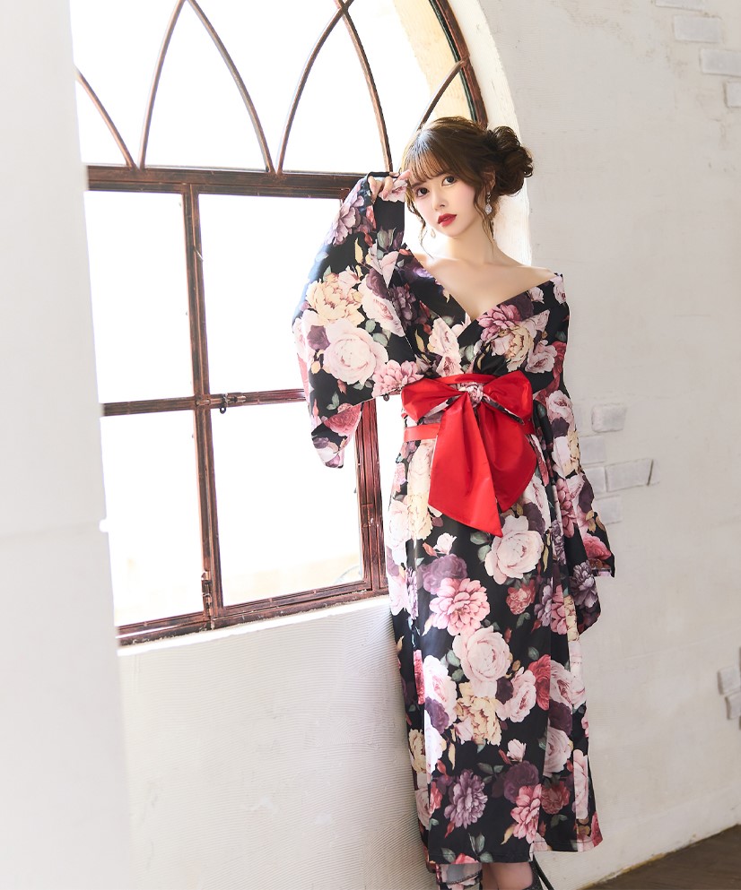 再入荷!【4カラー/2点セット】 花柄 オフショル ロング 前開き 帯 リボン 花魁 着物 ドレス コスプレ イベント ハロウィン キャバドレス