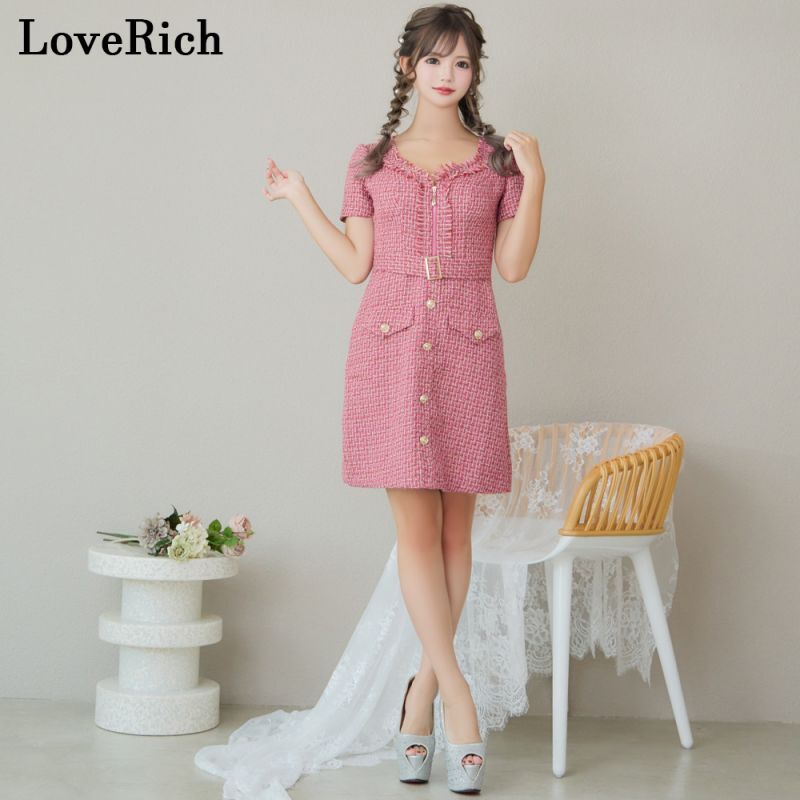 【SALE30%OFF】【SMLサイズ/3カラー】ツイード ジップ 袖付き 背中隠し ベルト風 ボタン タイト ミニドレス キャバドレス [1296]