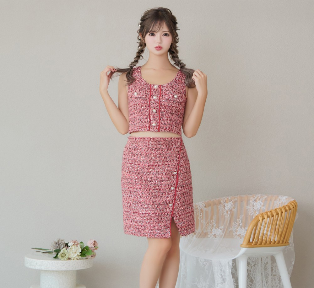 【3500円ぽっきり】【SMLサイズ】ツイード セットアップ ノースリーブ スリット 背中隠し ボタン タイト ミニドレス キャバドレス [1293]