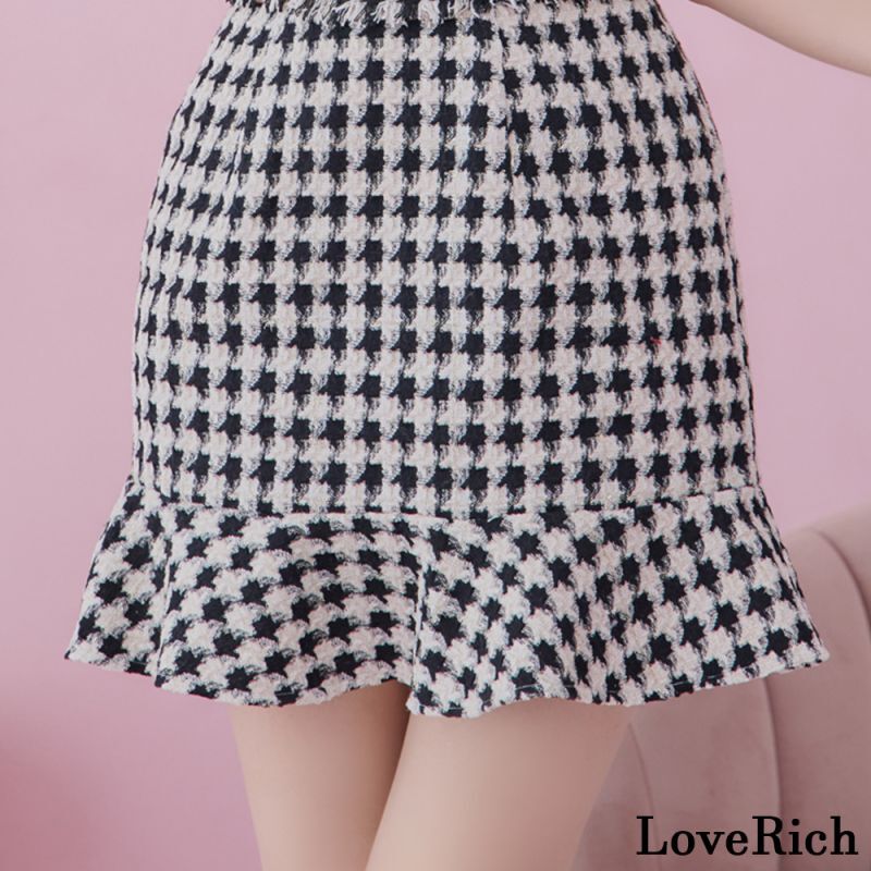 トレンドの千鳥柄ツイード生地を使用し、キャミソールトップスとマーメイドスカートのセットアップドレスになっています。