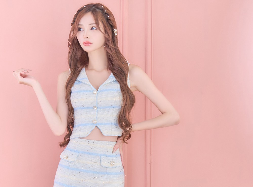 トップスは襟付きのノースリーブで、清潔感とセクシーさを兼ね備えたルックに。