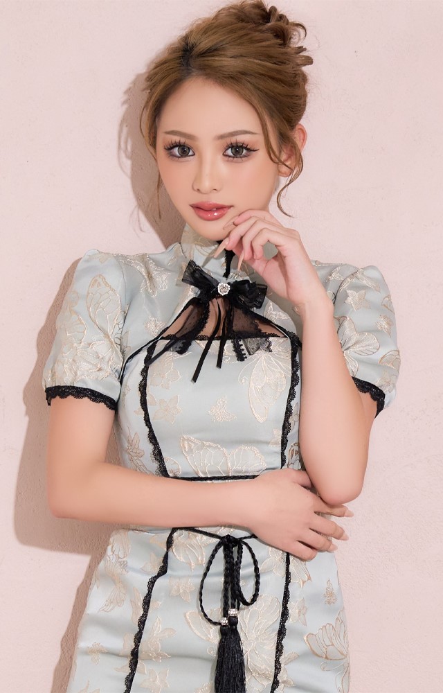 上品な光沢のある蝶々柄の生地を使用したフェミニンなチャイナドレス。