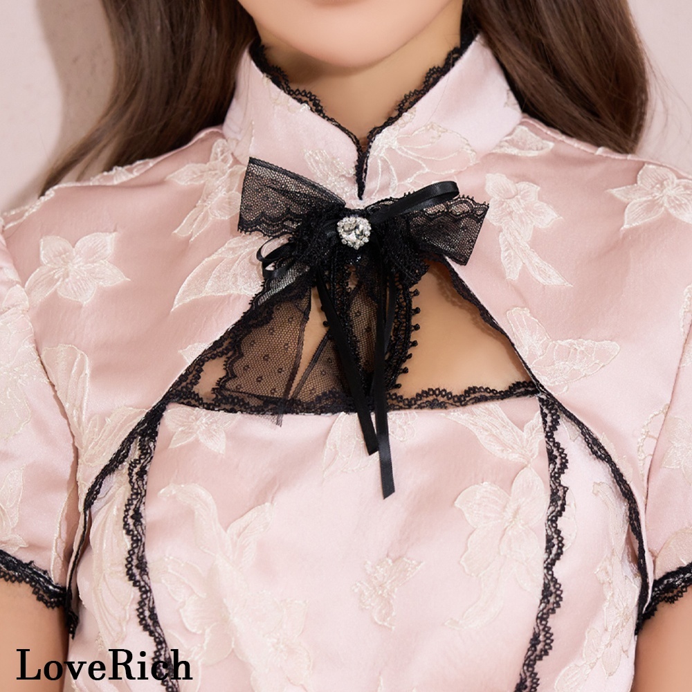 【SMLサイズ/2カラー】蝶々柄 ウエスト編み上げ レースアップ デコルテカット リボン レース スリット パフスリーブ 美胸 谷間魅せ 美脚 チャイナドレス チャイナ服 ミニ コスプレ イベント ハロウィン キャバドレス [1537]