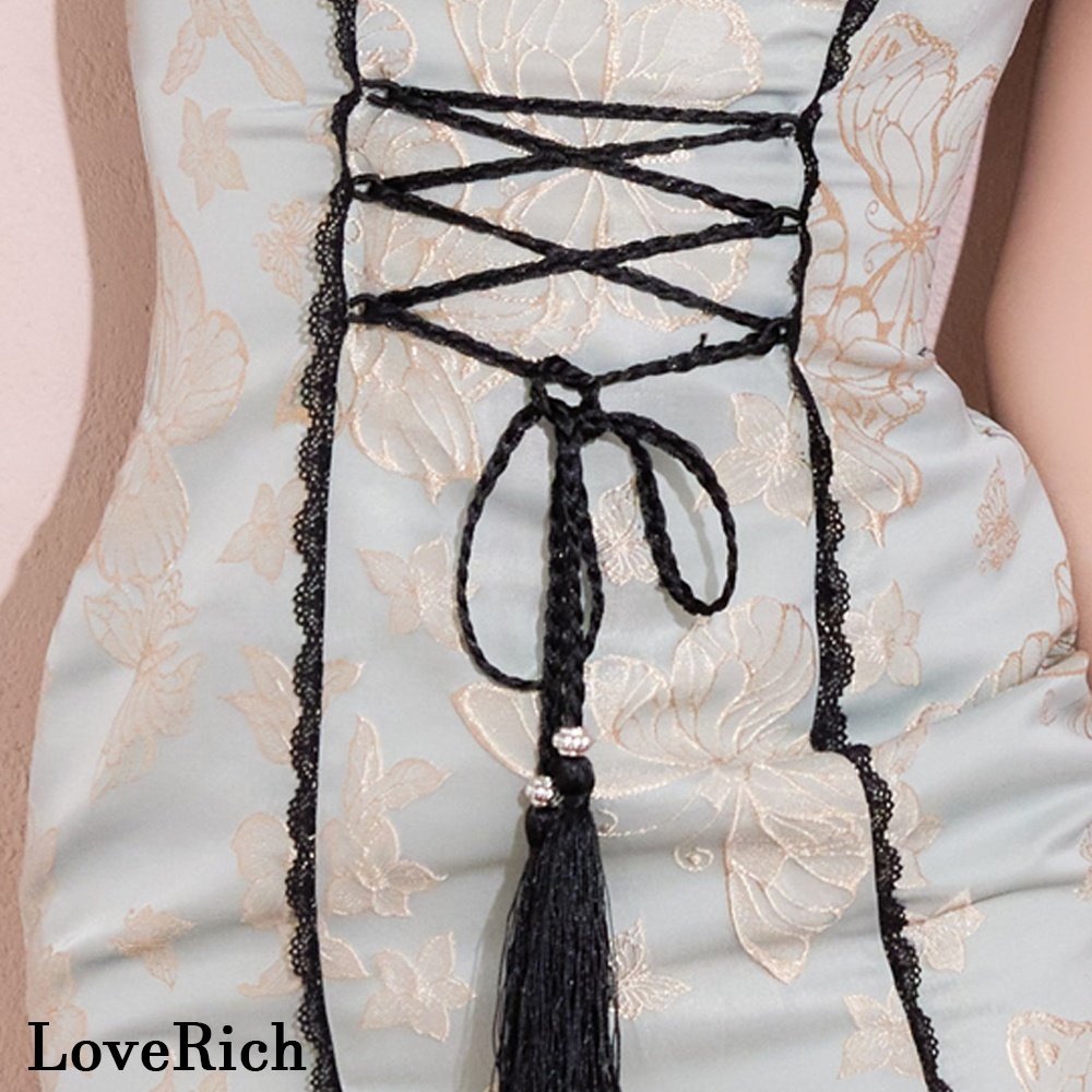 ウエスト部分はチャイナ特有の腰紐を使った編み上げデザインになっており、ウエストラインを美しく引き立てます。