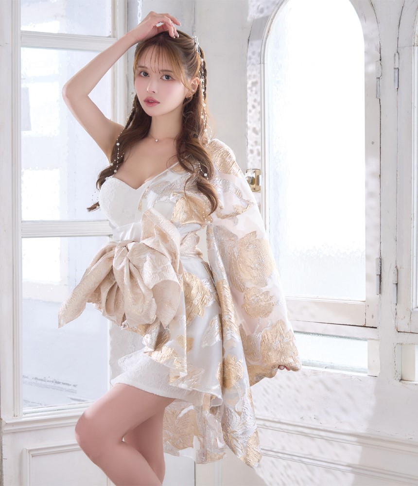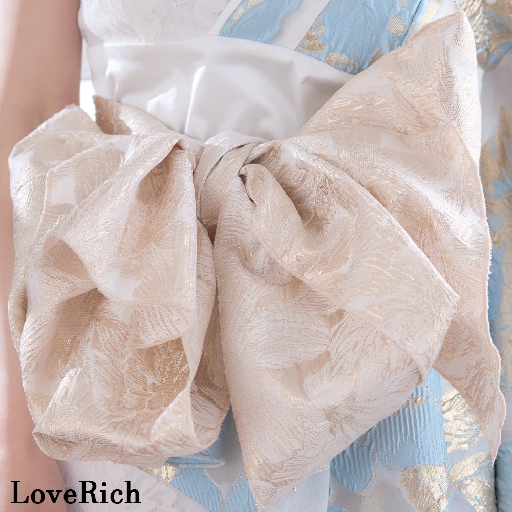胸元はデコルテを美しく魅せ、大きな帯で作ったリボンがウエストラインを引き締めつつ華やかさをプラス。
