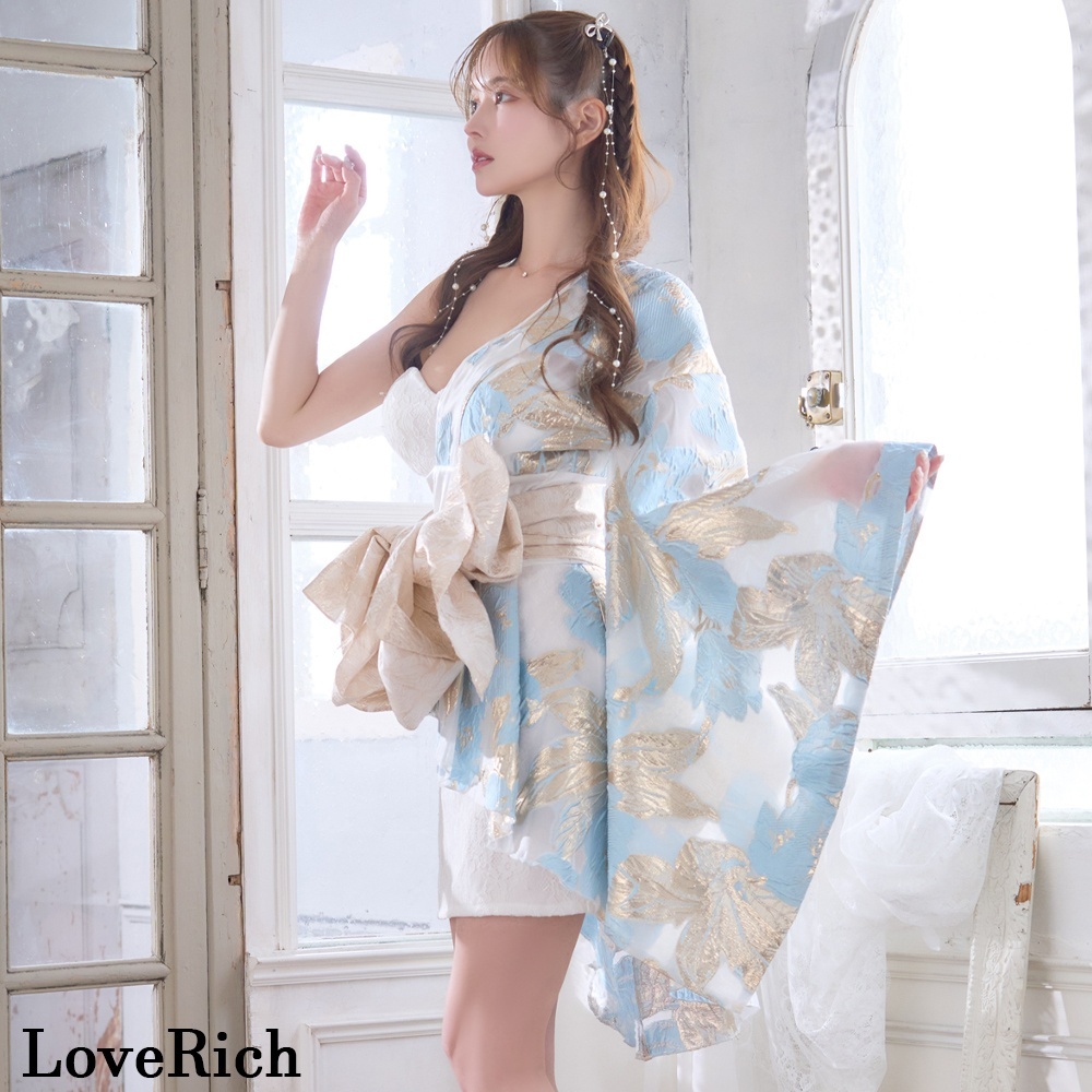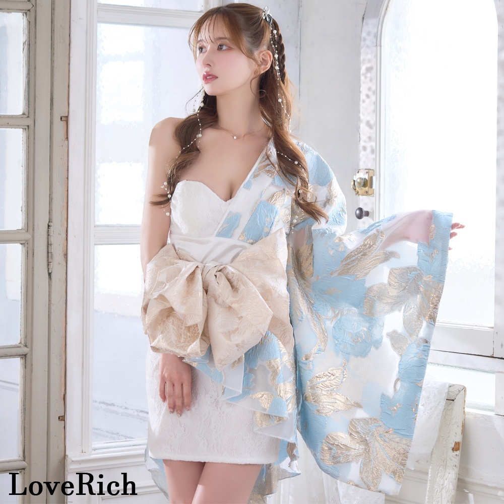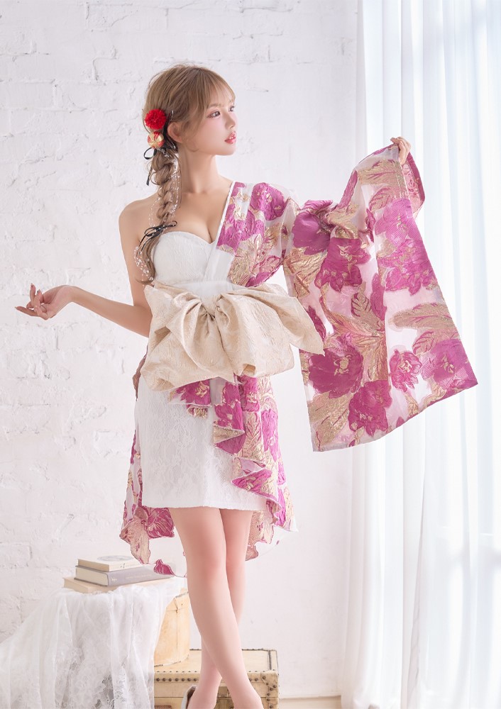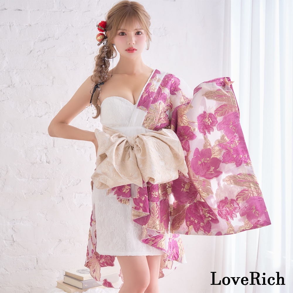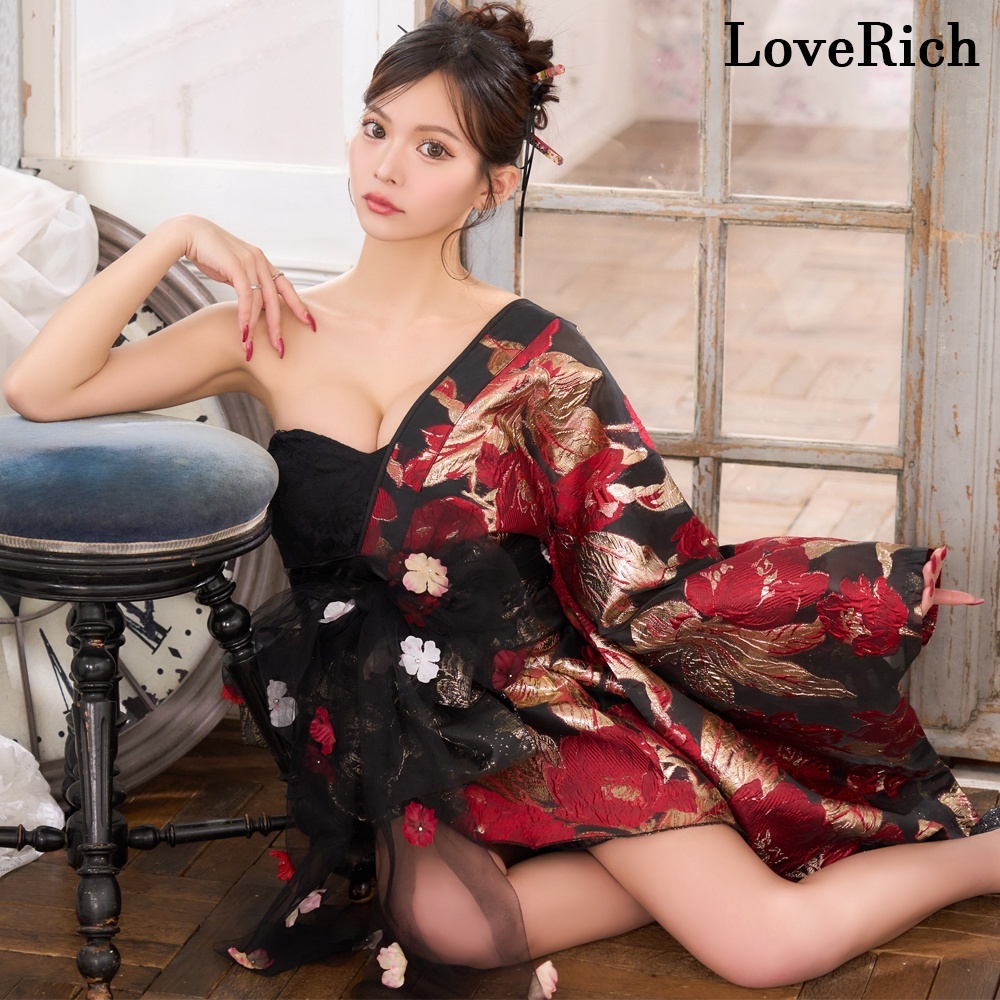【高級ライン】【4カラー/2点セット】ワンショル アシンメトリー 花柄 レース ミニ 豪華 帯 花魁 着物 ドレス コスプレ ハロウィン キャバドレス [1524]