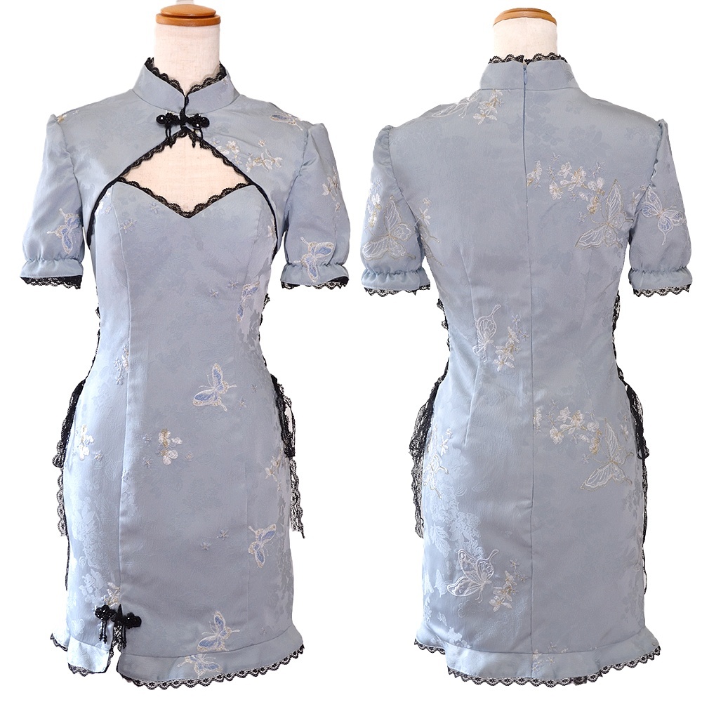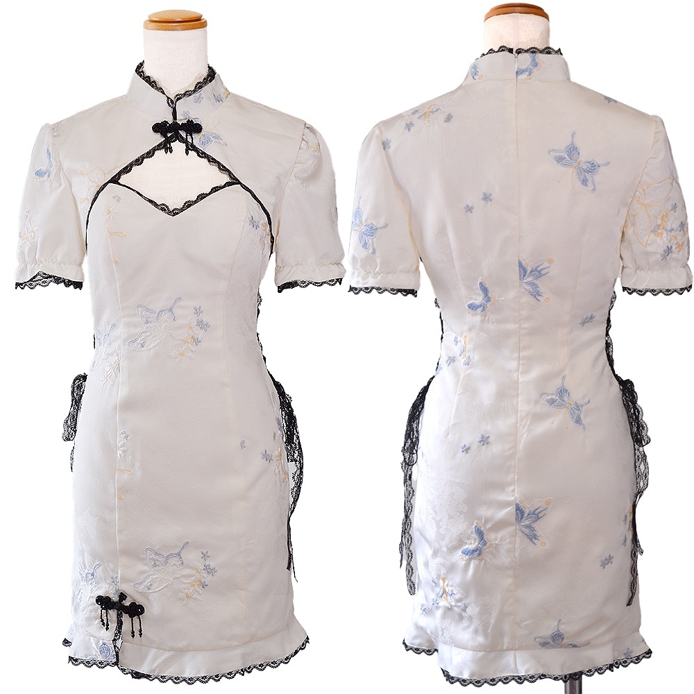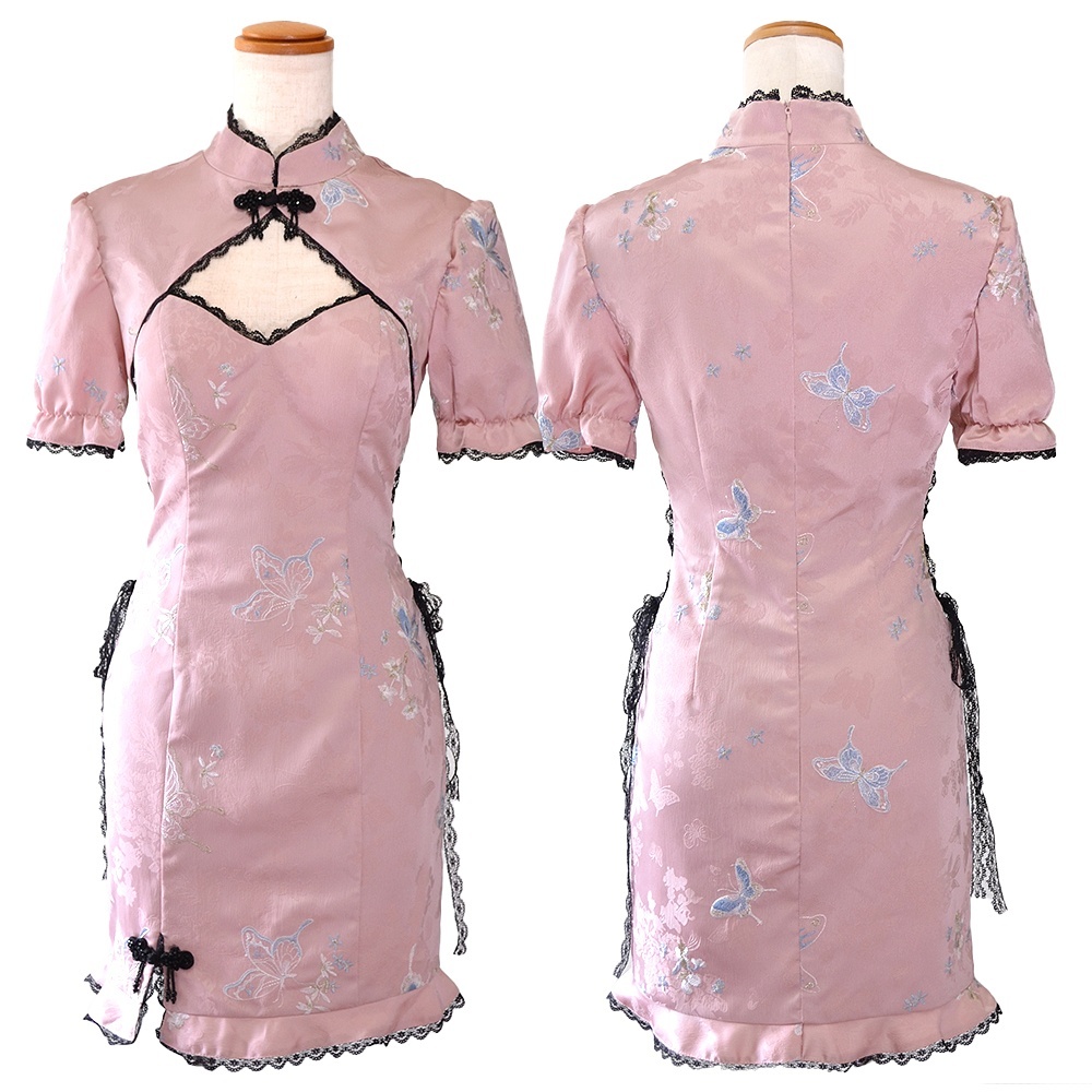 【SMLサイズ/3カラー】蝶々柄 刺繍 ウエスト編み上げ レースアップ デコルテカット 美胸 谷間魅せ 美脚 チャイナドレス チャイナ服 ミニ コスプレ イベント ハロウィン キャバドレス [1576]