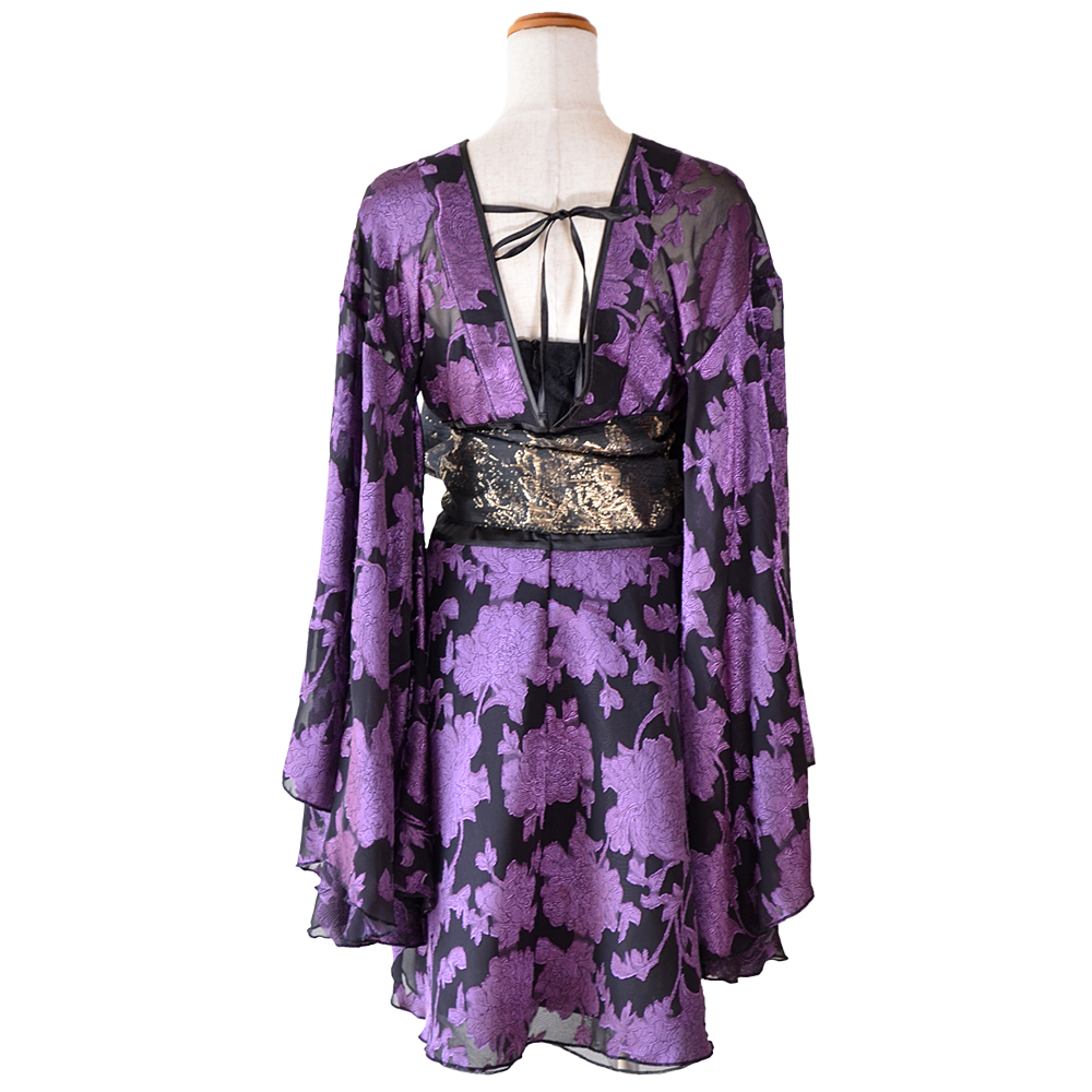 なめらかに広がるシフォン袖と深みのある紫の花柄が視線を惹きつける花魁ドレス。