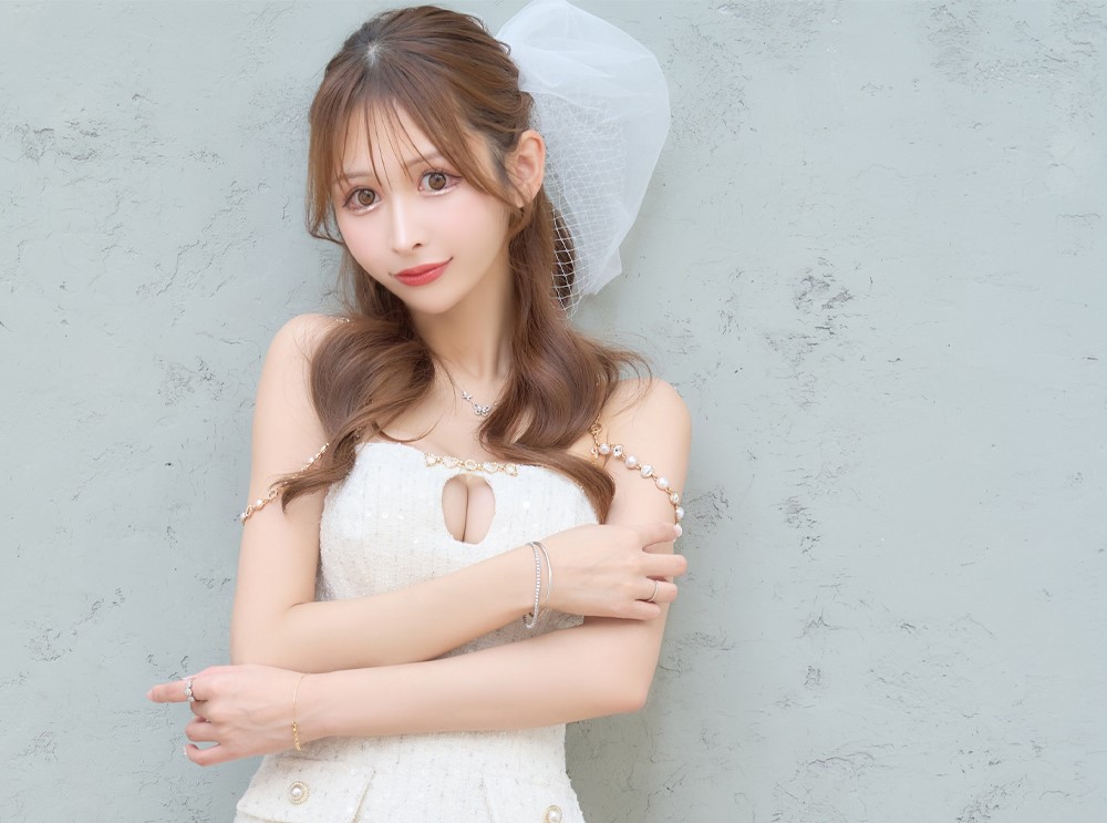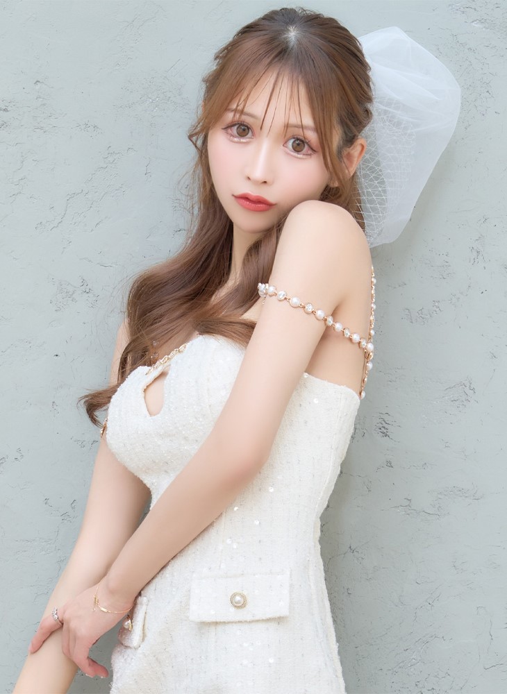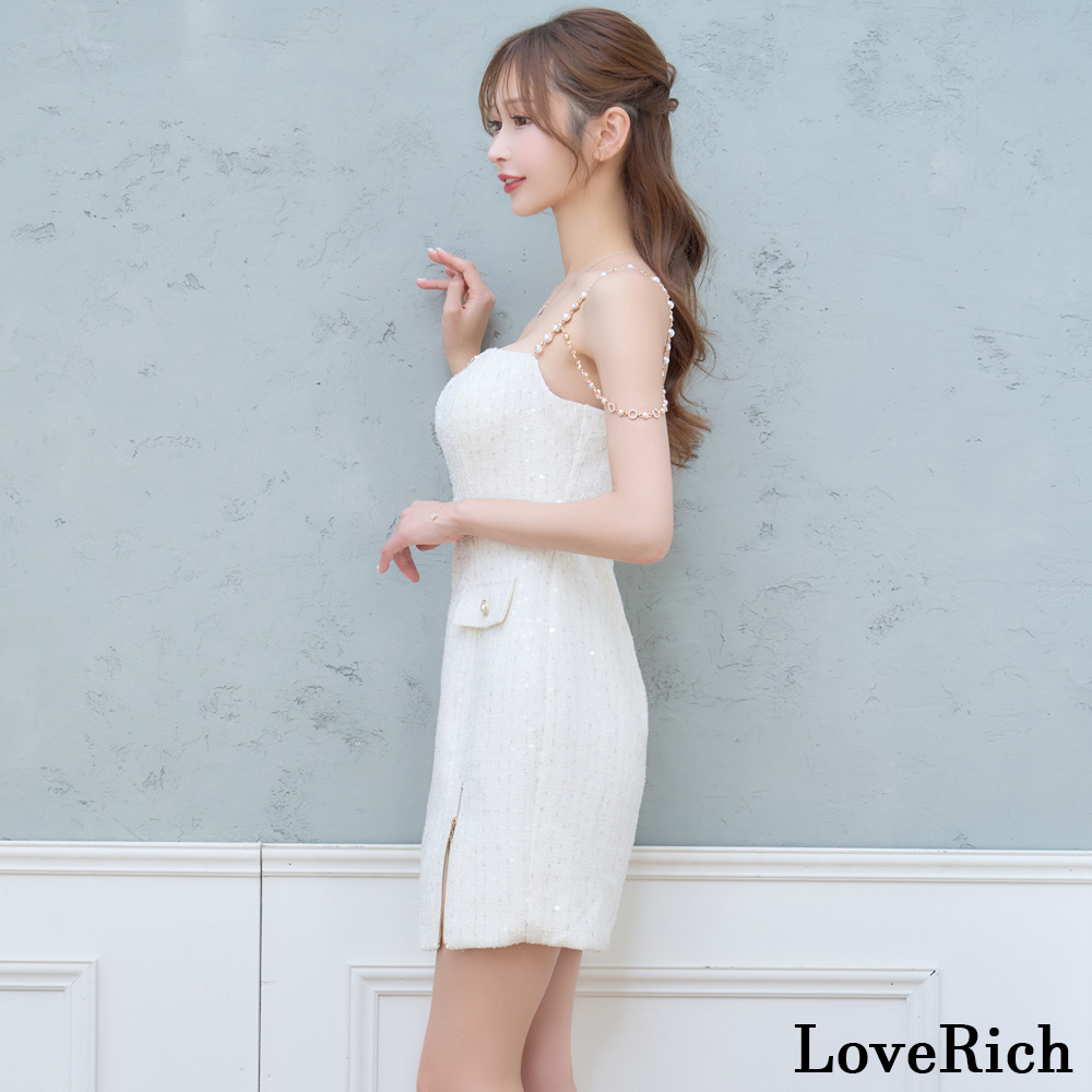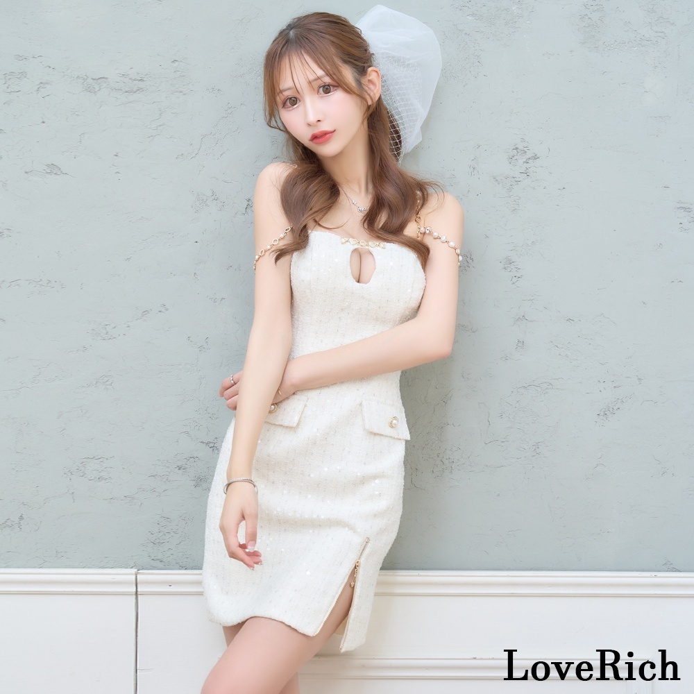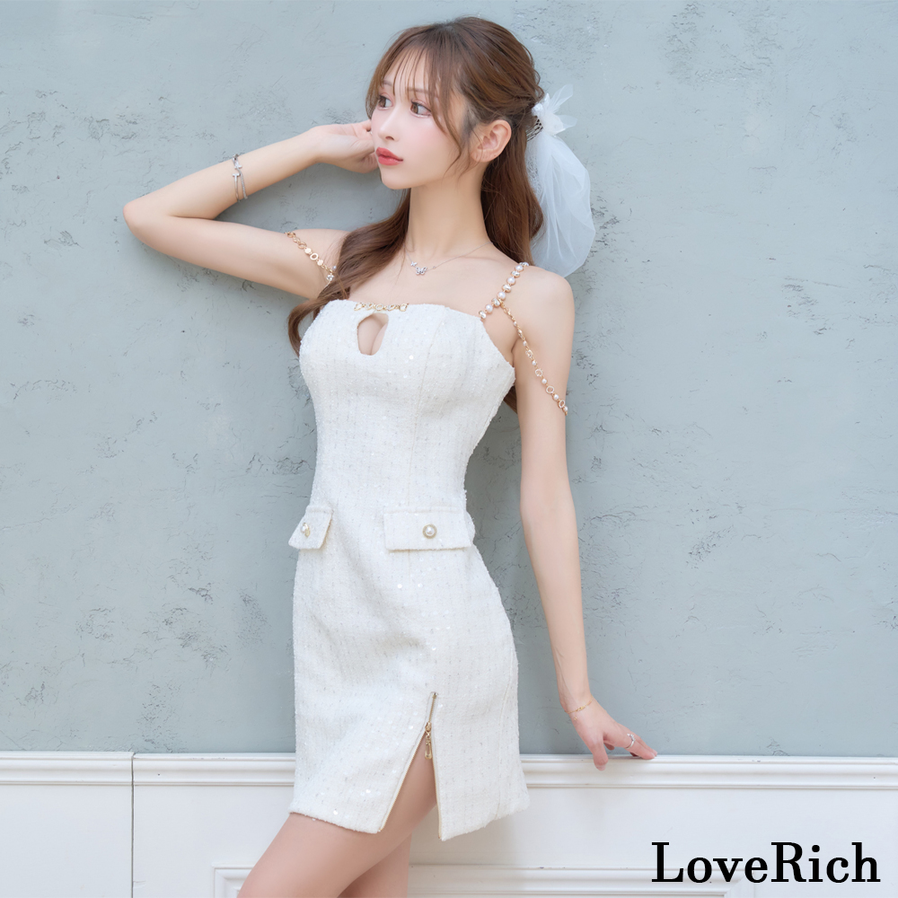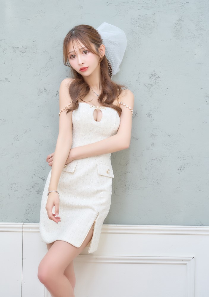 デコルテや腕を華奢魅せするパールチェーンのストラップと、胸元のホールデザインが女性らしい色気を演出。