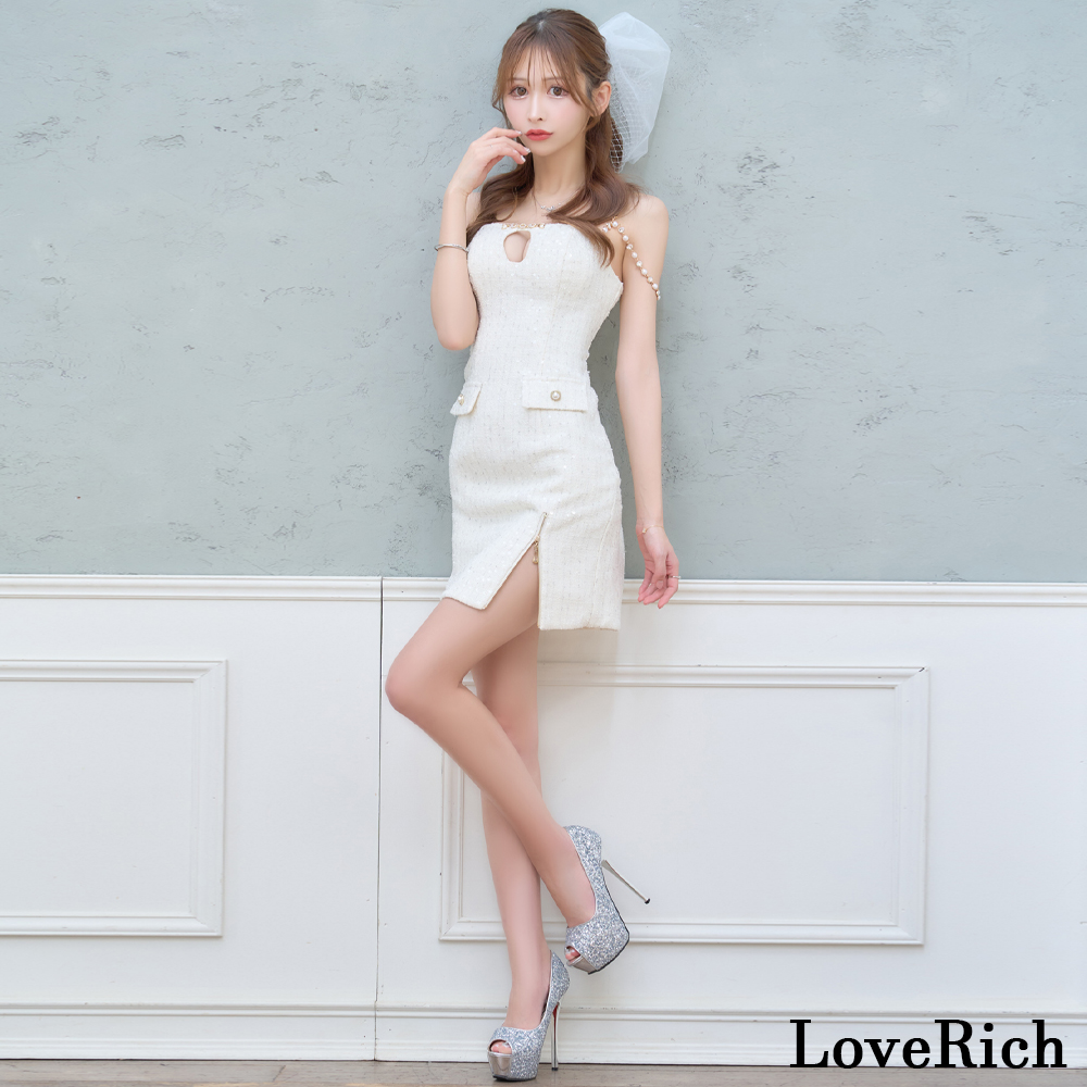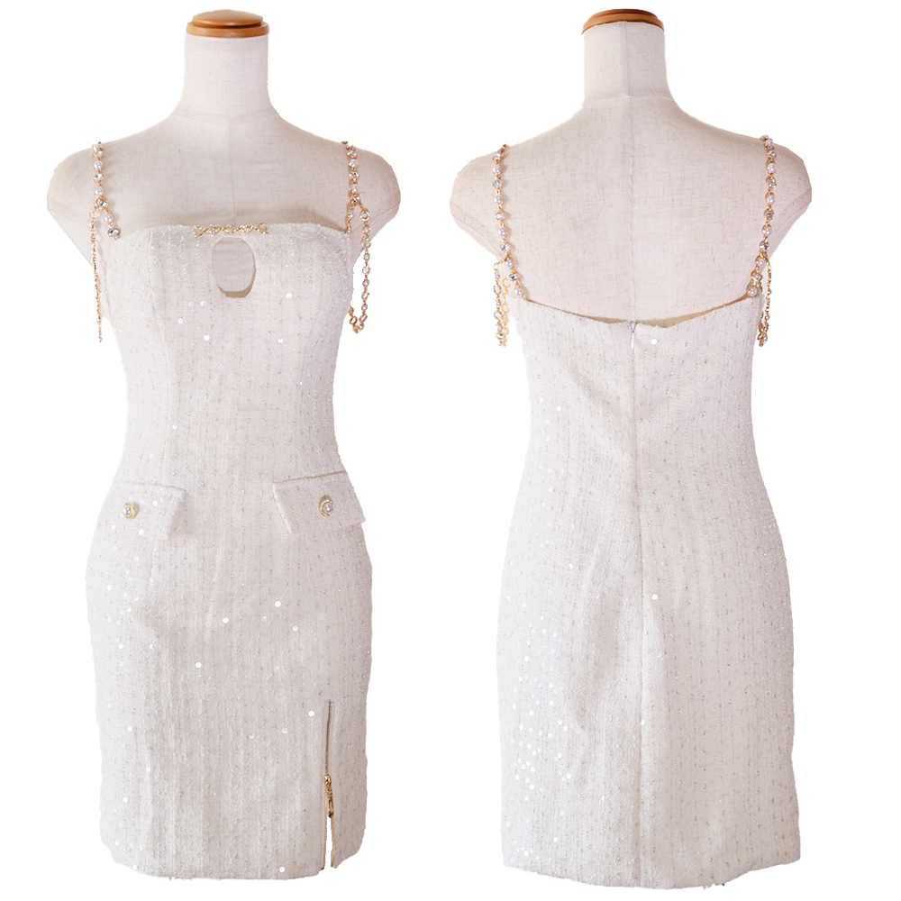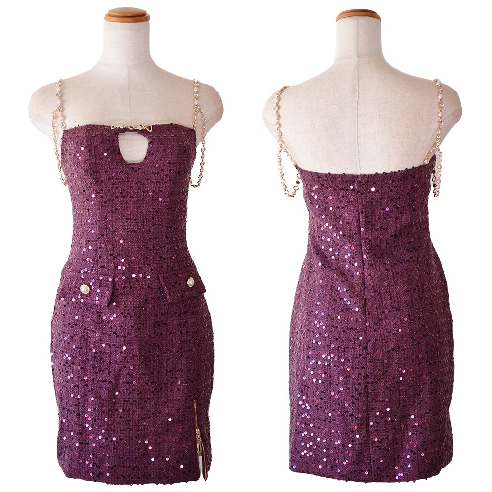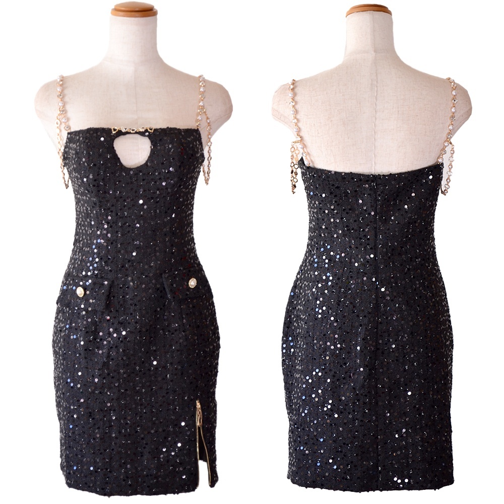 【SMLサイズ/4カラー】パール チェーン スパンコール タイト スリット 美胸 美脚 タイト ミニドレス キャバドレス