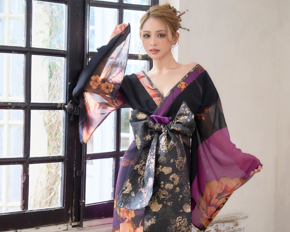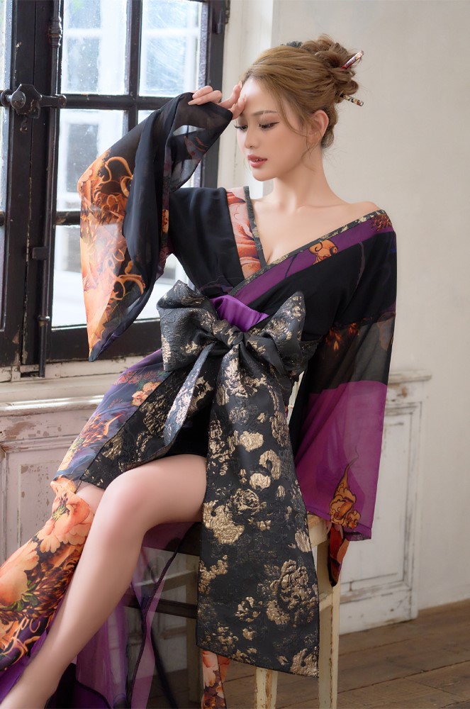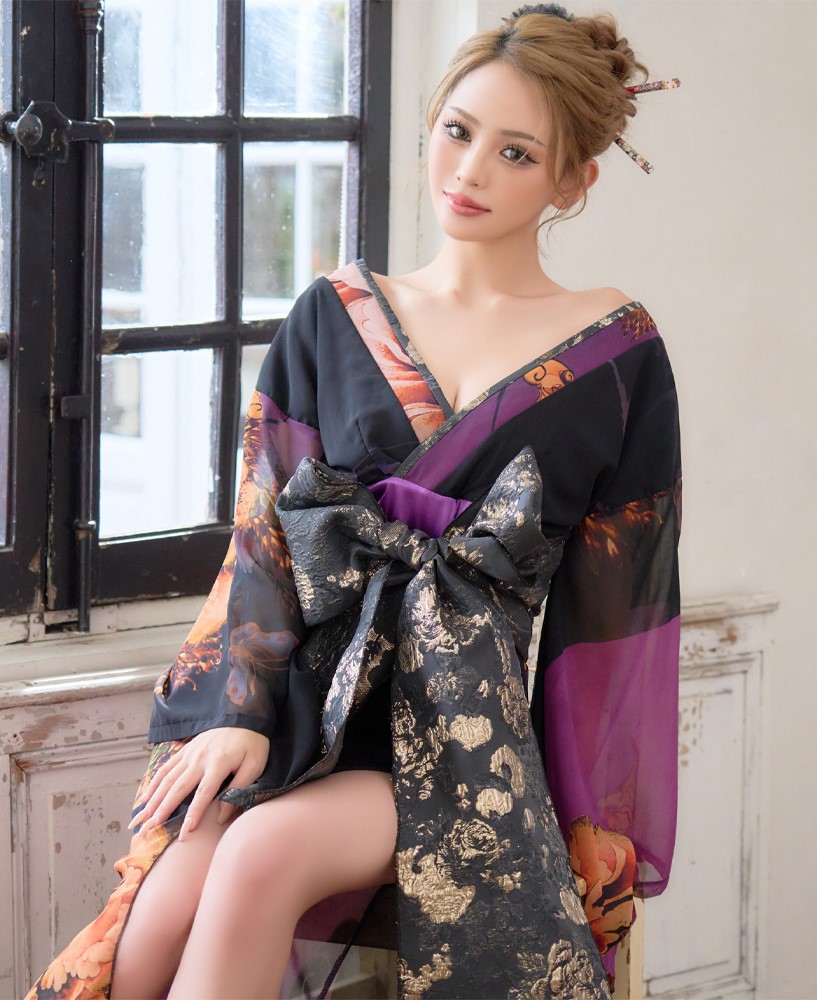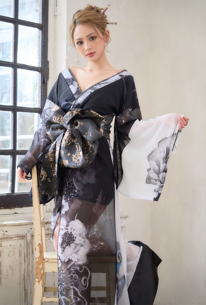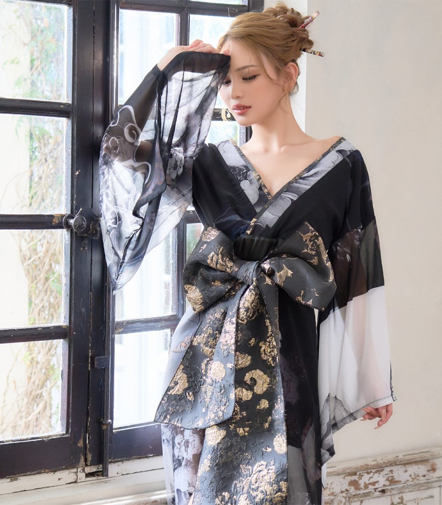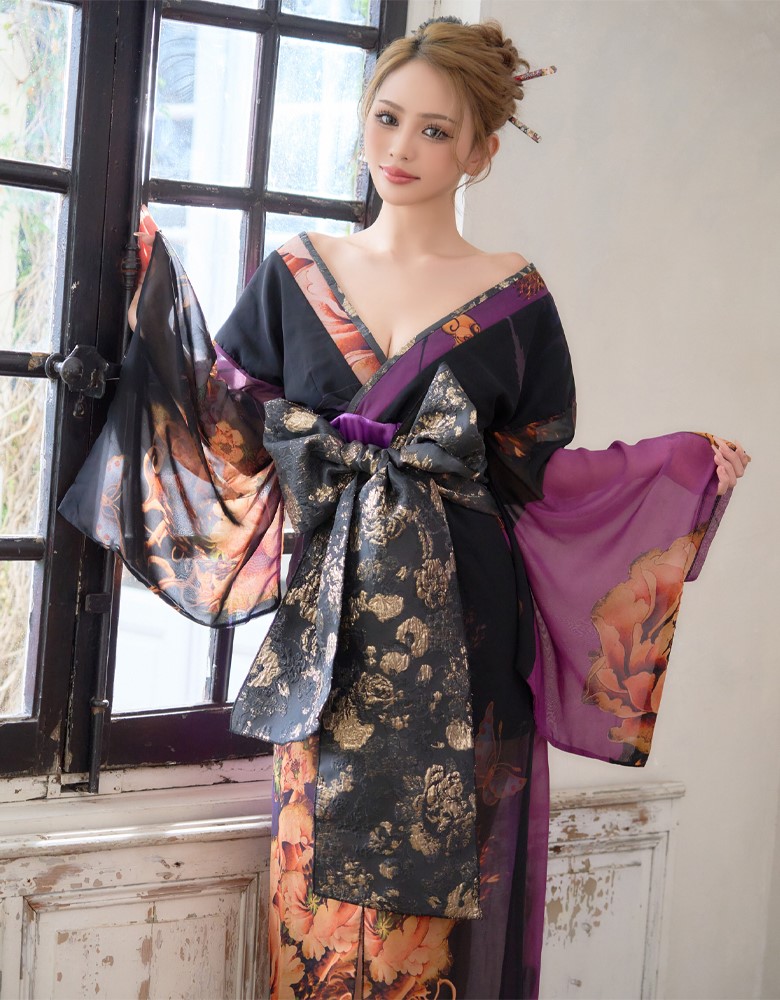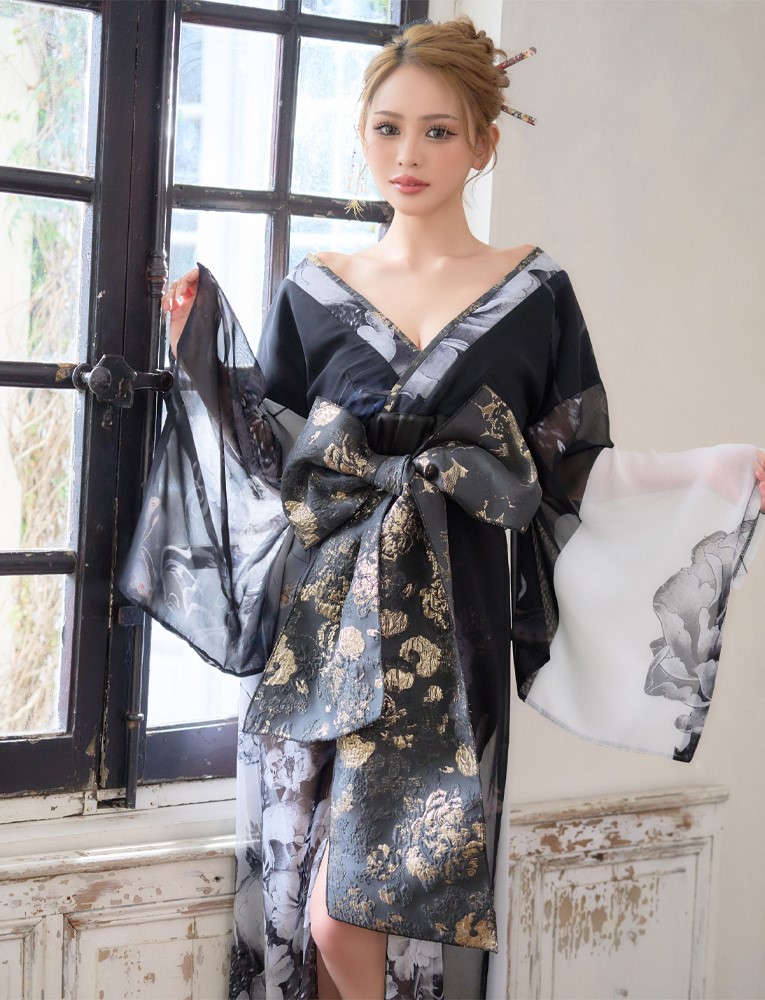 送料無料!【高級ライン】【2点セット】オリエンタルフラワー シフォン 花柄 スリット 豪華 帯 花魁 着物 ドレス コスプレ ハロウィン キャバドレス