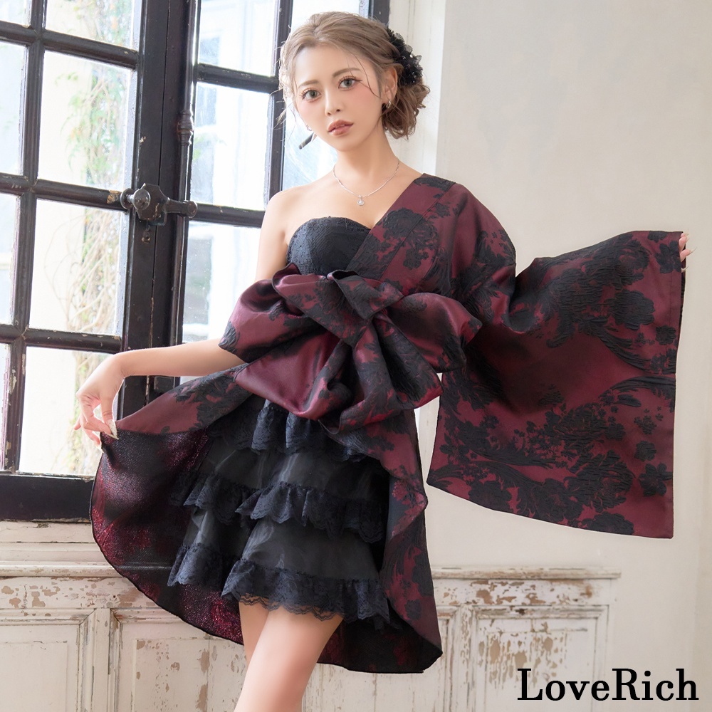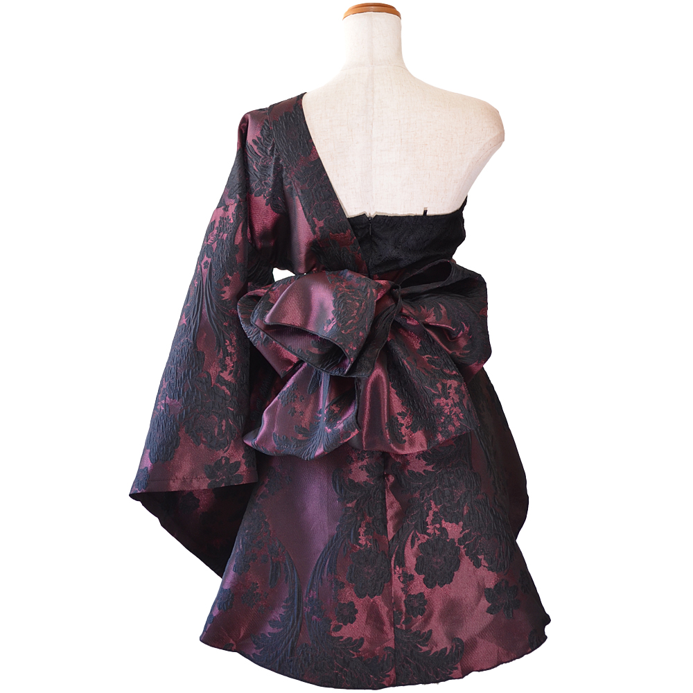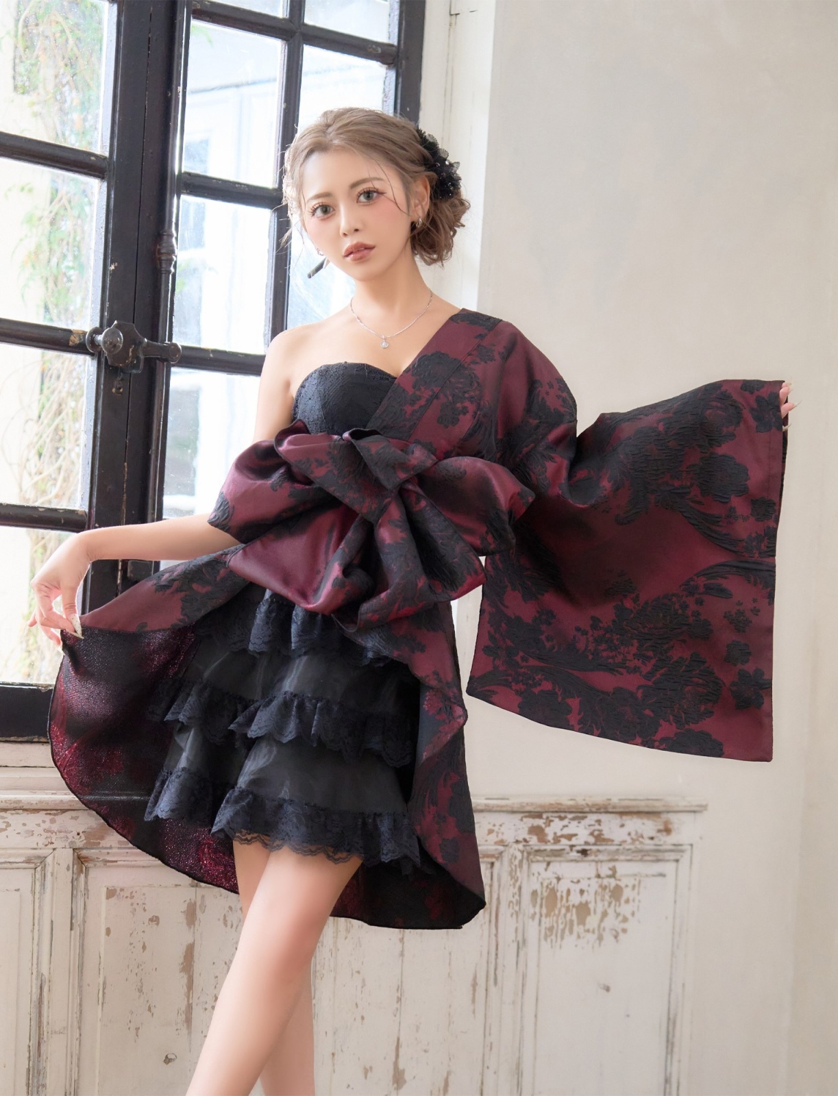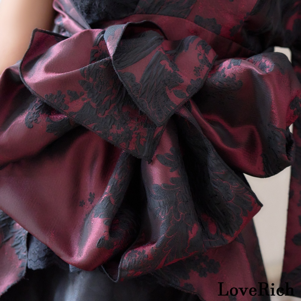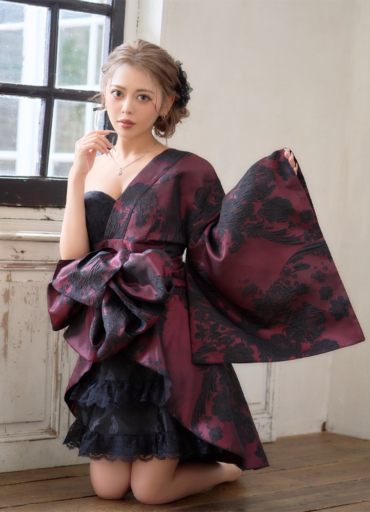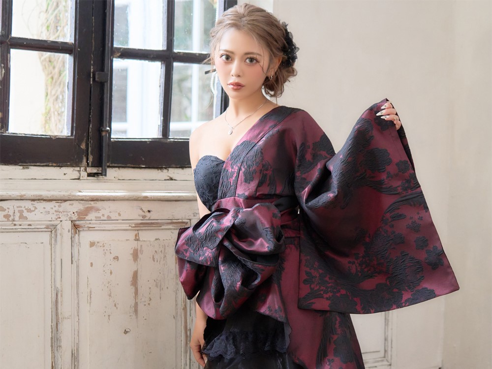 深みのあるボルドーカラーにブラックのフラワー柄が映える花魁ドレス。