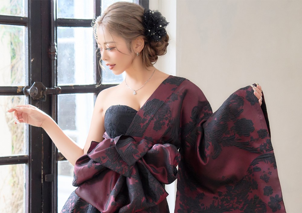 和の艶やかさとドレスの華やかさを融合させた一着は、撮影の衣装としても主役級の仕上がりに。