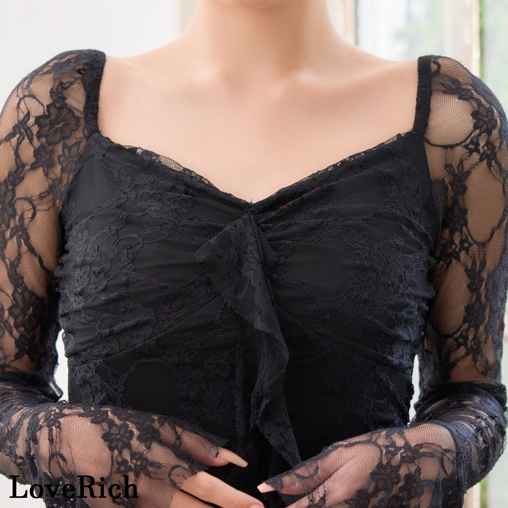 デコルテを美しく魅せるスクエアネックと透け感のあるレーススリーブが上品さと色気を両立。