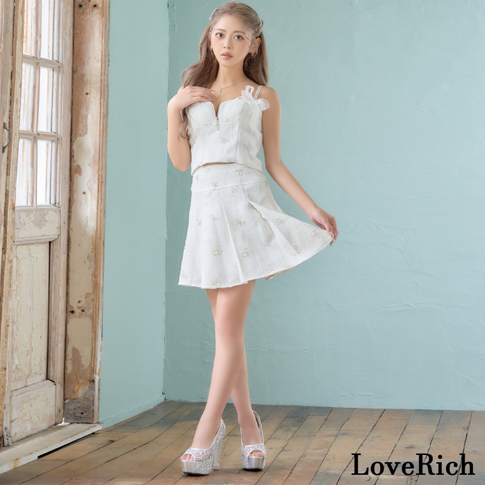 繊細なビースであしらわれたリボンモチーフが上品な華やかさを演出するセットアップミニドレス。