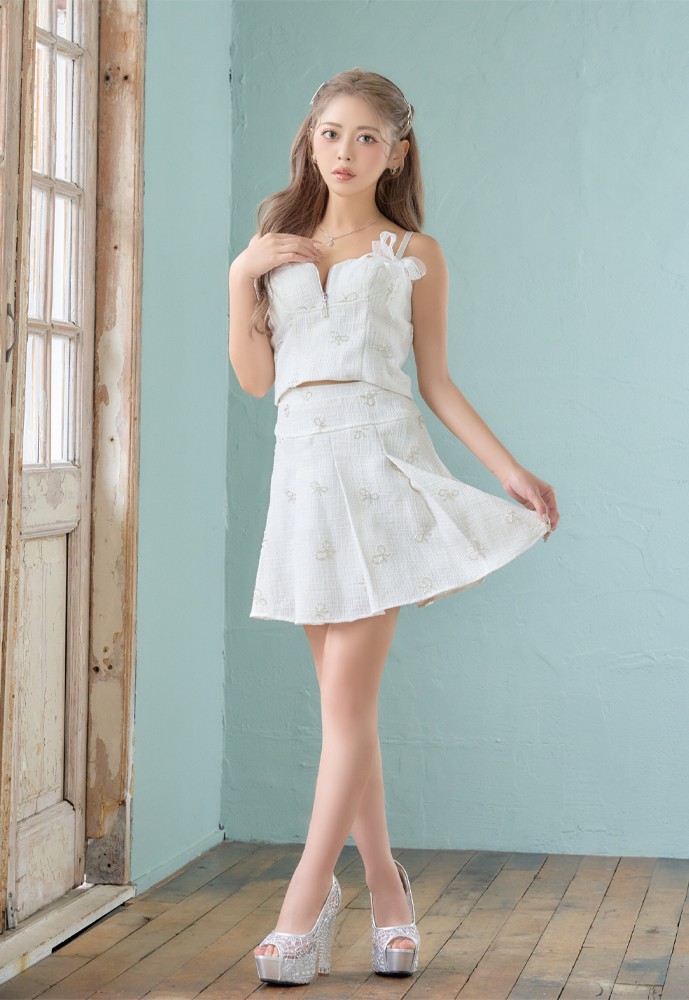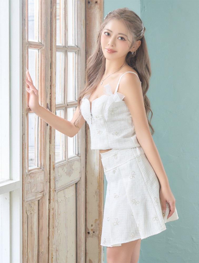 【SMLサイズ】ビースリボン ツイード フロントジップ セットアップ フレアスカート リボン ミニドレス キャバドレス